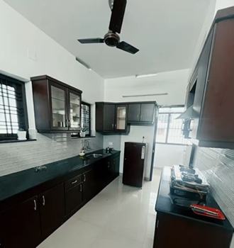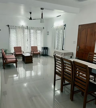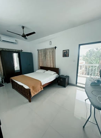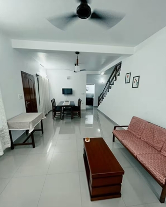 This 3-bedroom house with 3 bathrooms features a balcony-accessible bedroom. It is equipped with a laundry service, water filter, kettle, fridge, gas stove, microwave, & an iron board. All bedrooms are air-conditioned, & solar hot water is always available. Located just a 5-minute walk from Kaloor main junction, hospitals, & malls, it offers convenience & comfort in a prime location.