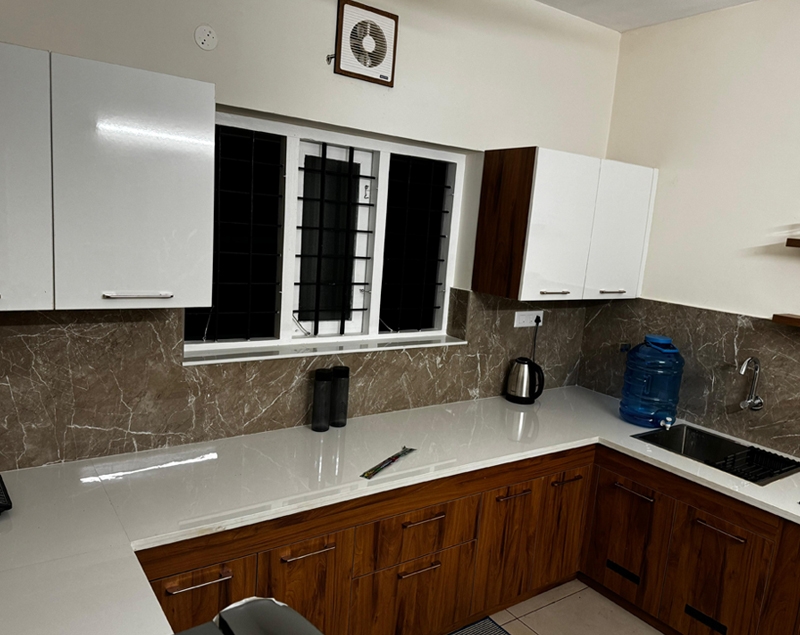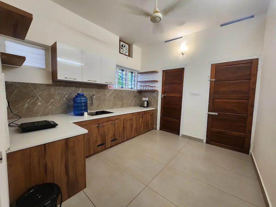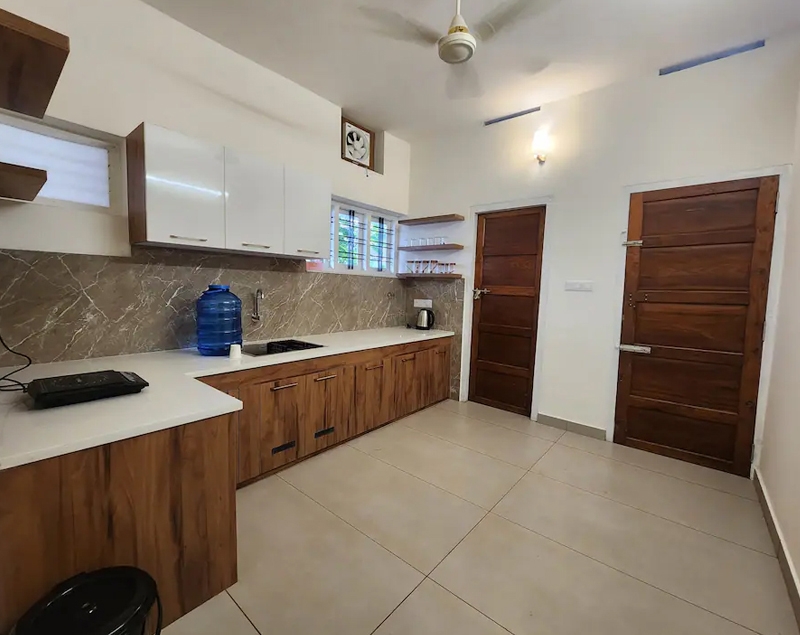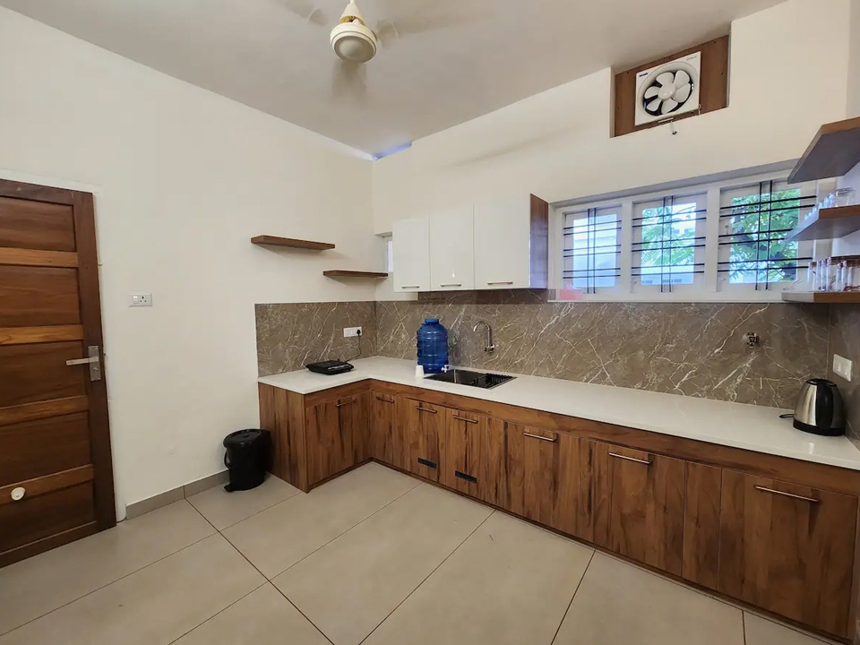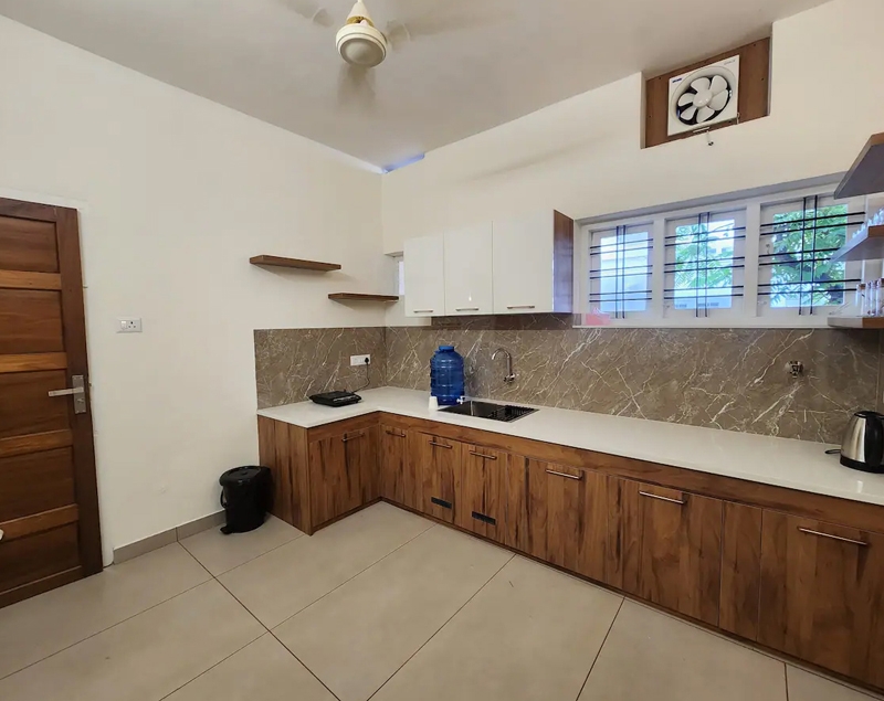 Fridge, electric stove, kettle, ceiling fan, ventilation windows, kitchen wardrobe, laundry service, window with air circulation