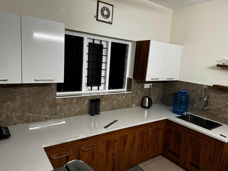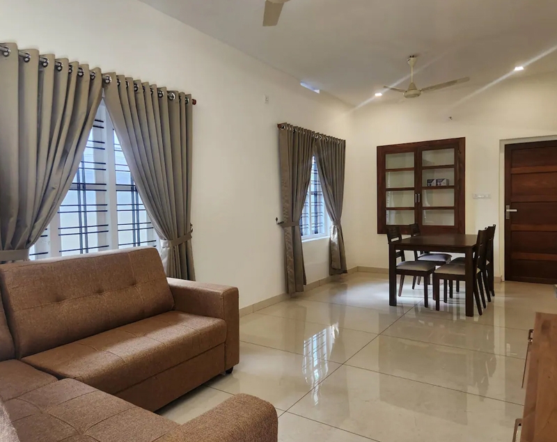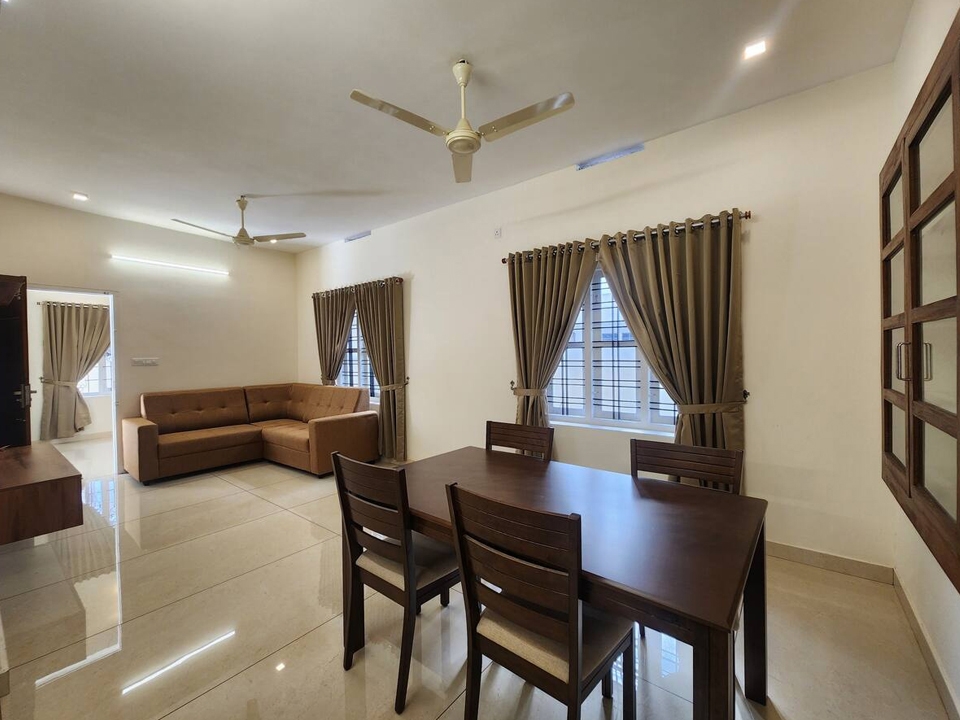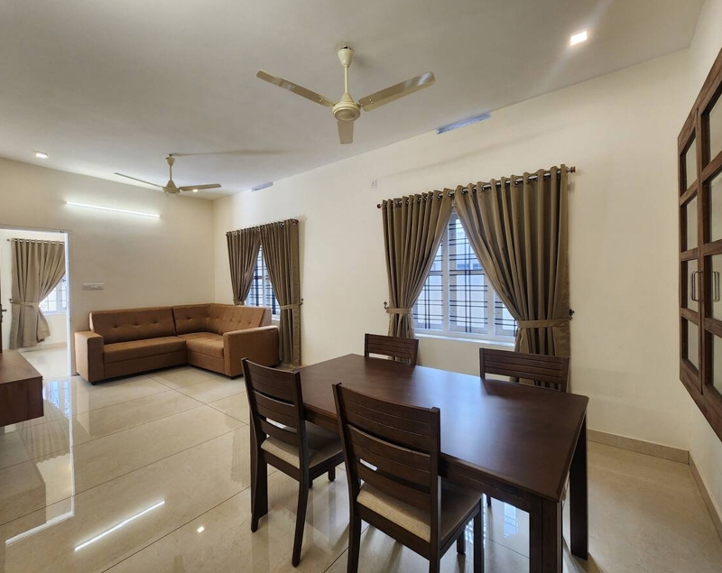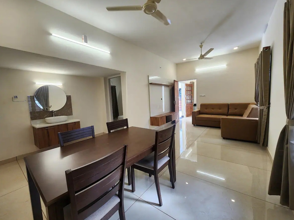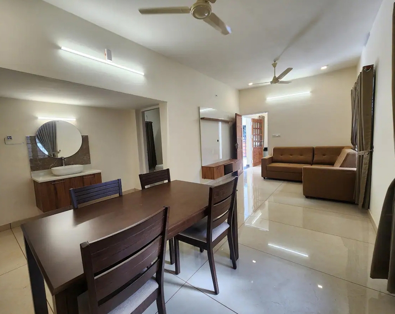 Table with chair sets, sofa set, tv, wash basin, ceiling fan, wall cabot, window with air circulation