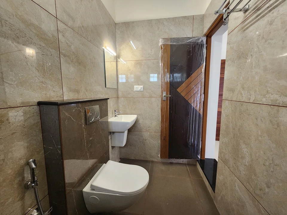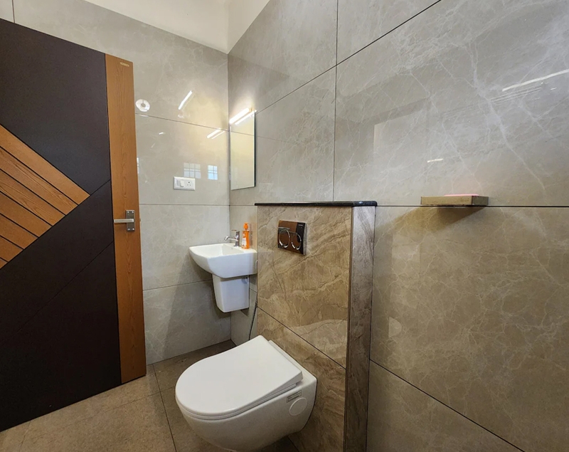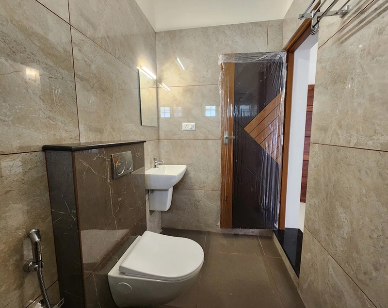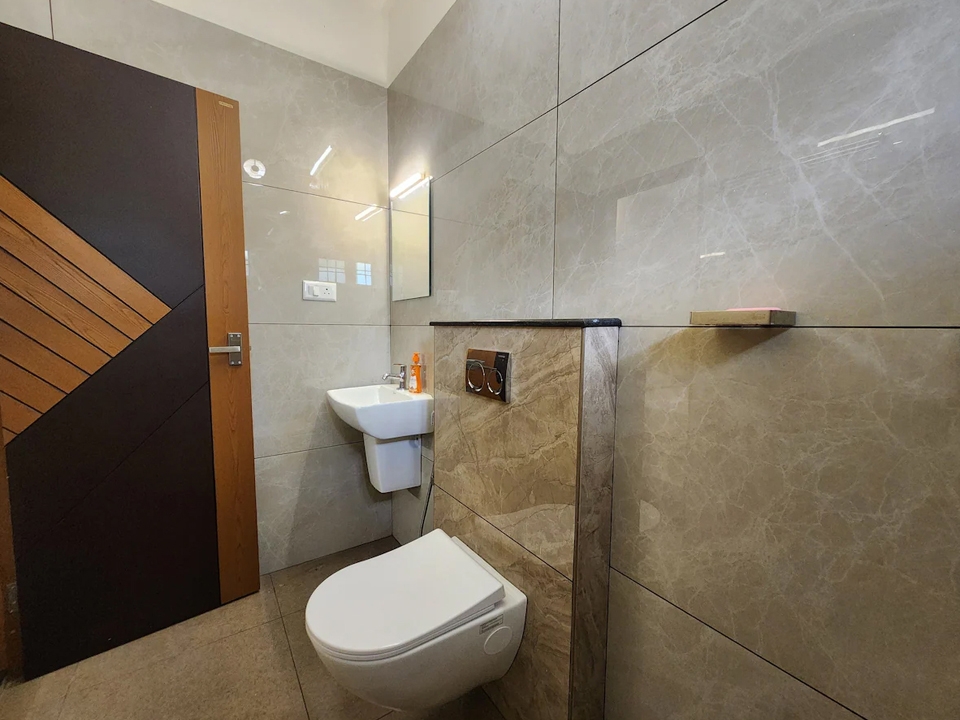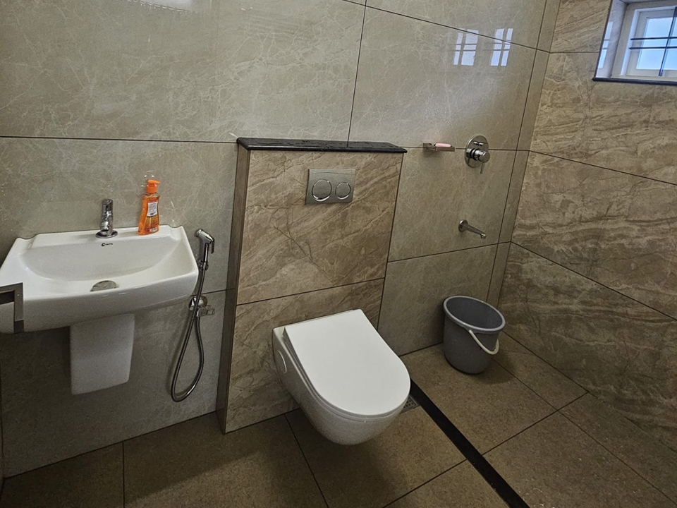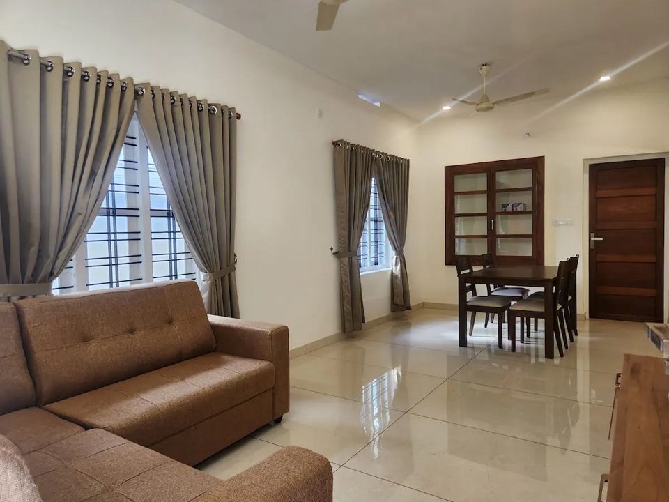 Table with chair sets, sofa set, tv, wash basin, ceiling fan, wall cabot, window with air circulation