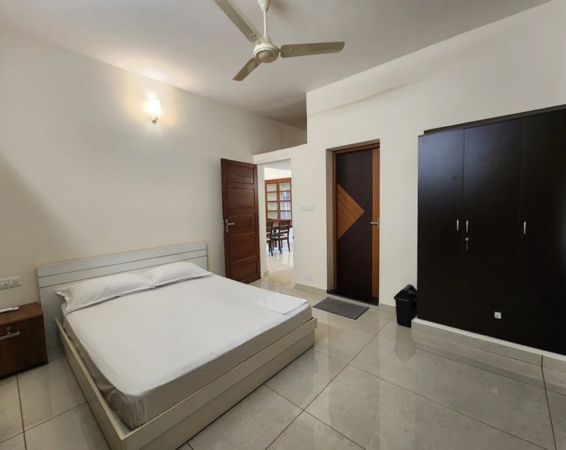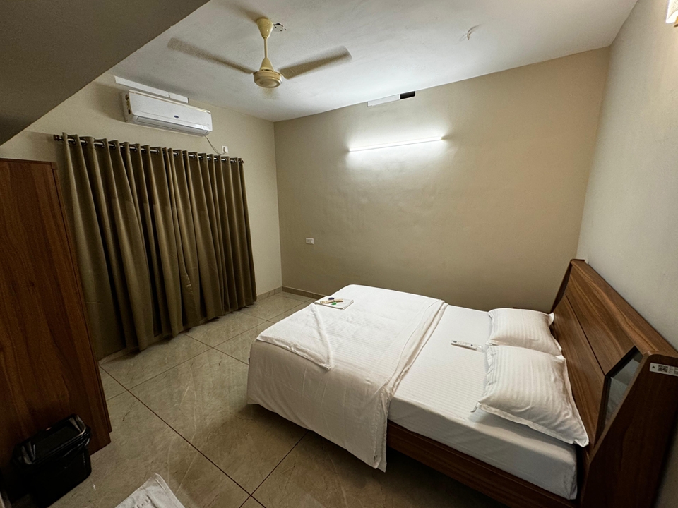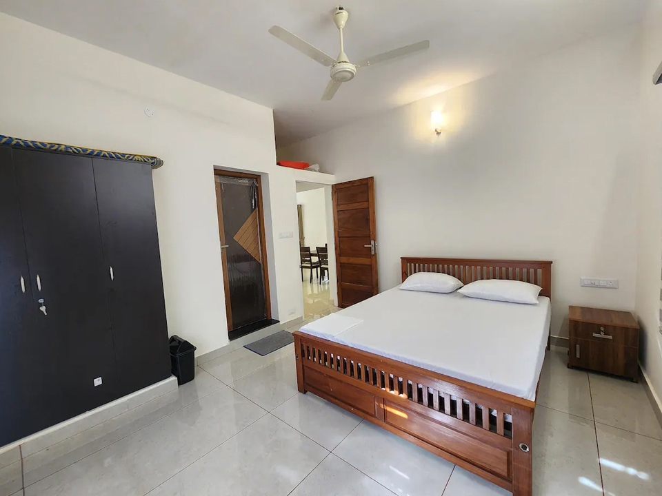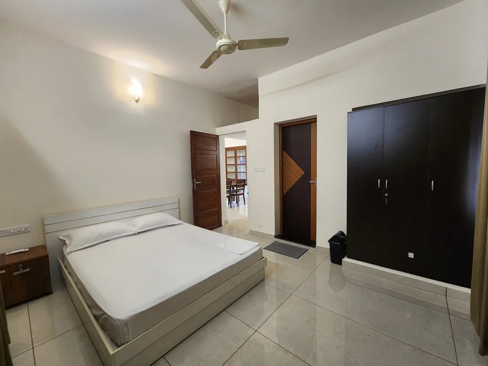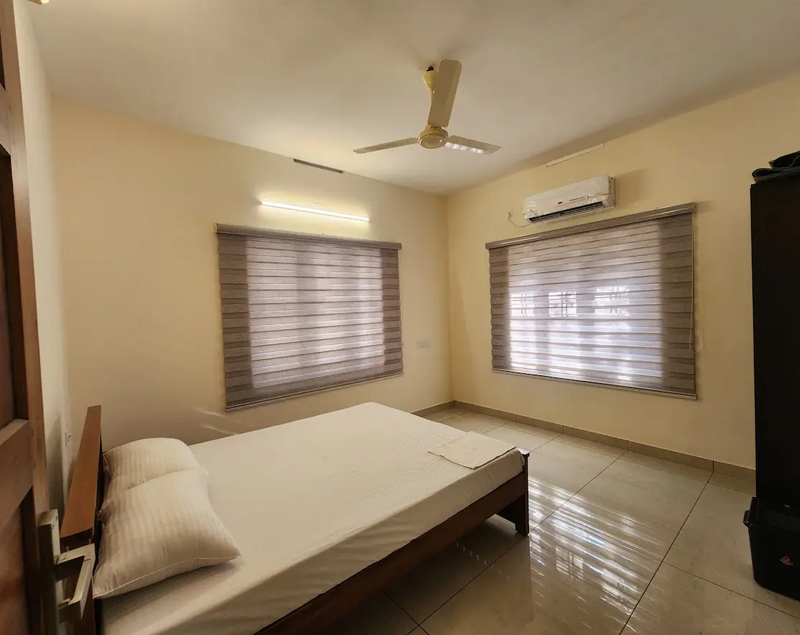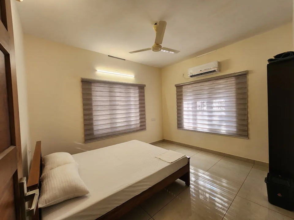 Double bed, air conditioning, attached bathroom, clothes storage, bed linen room-darkening blinds, ceiling fan, balcony access, window with air circulation