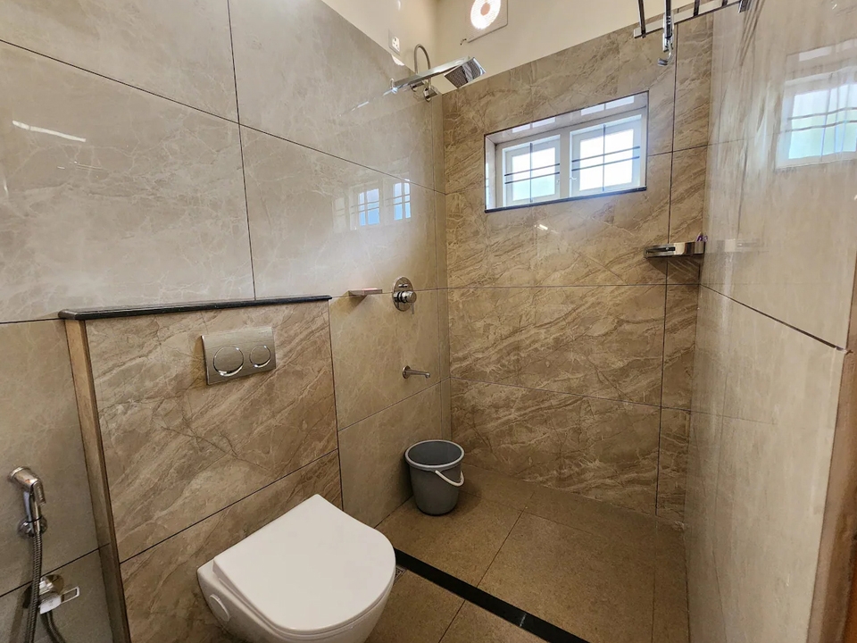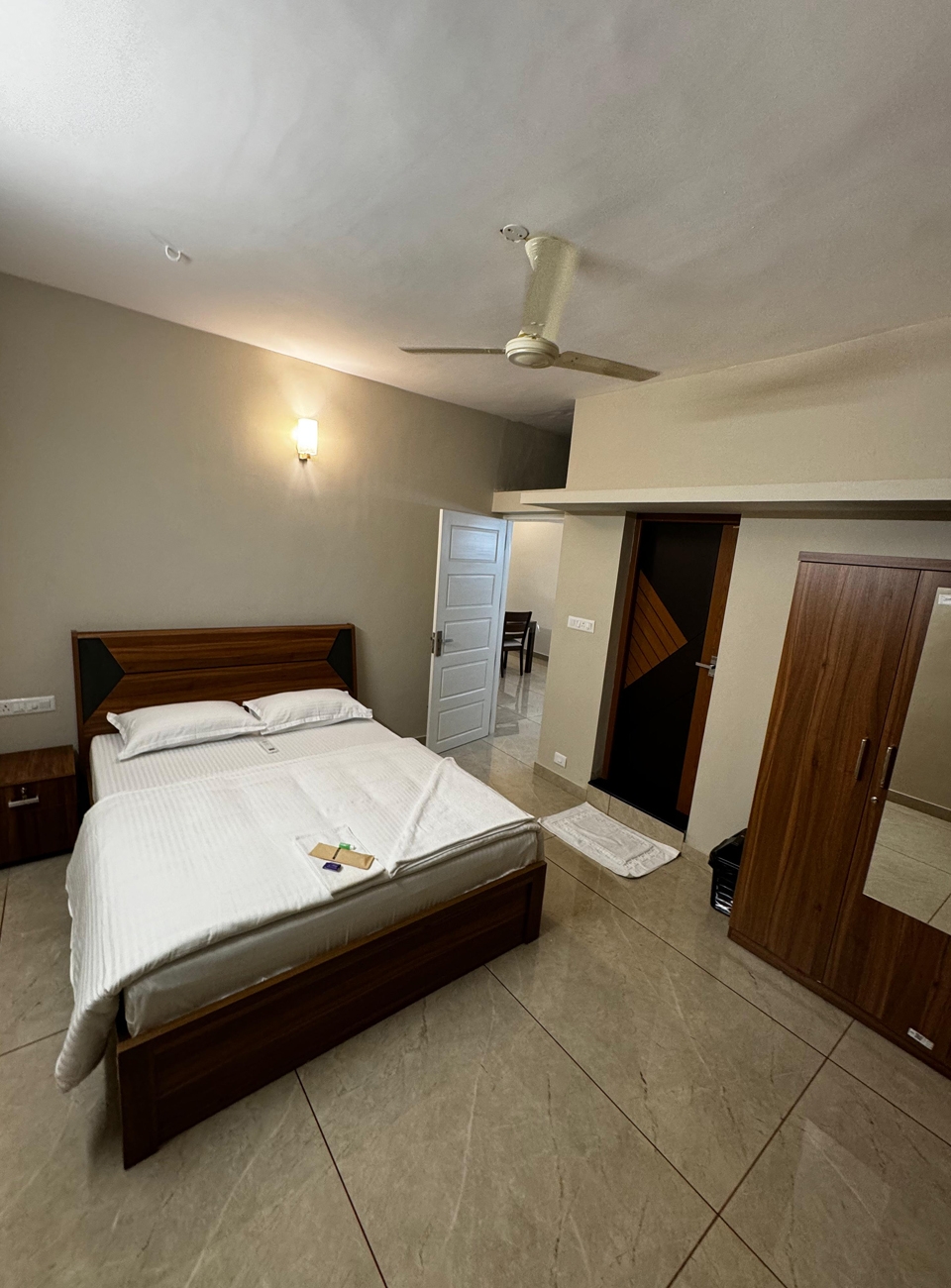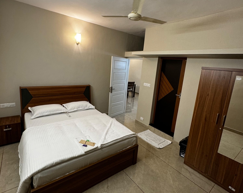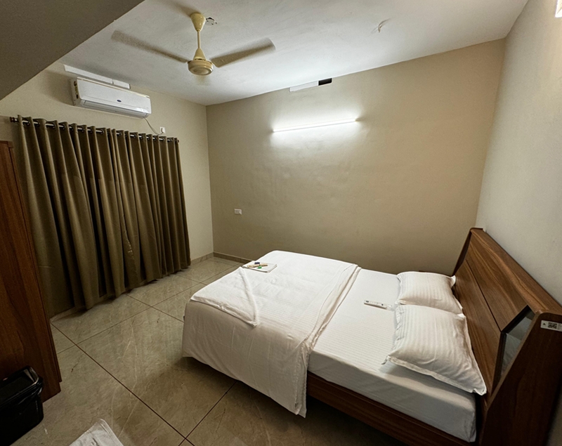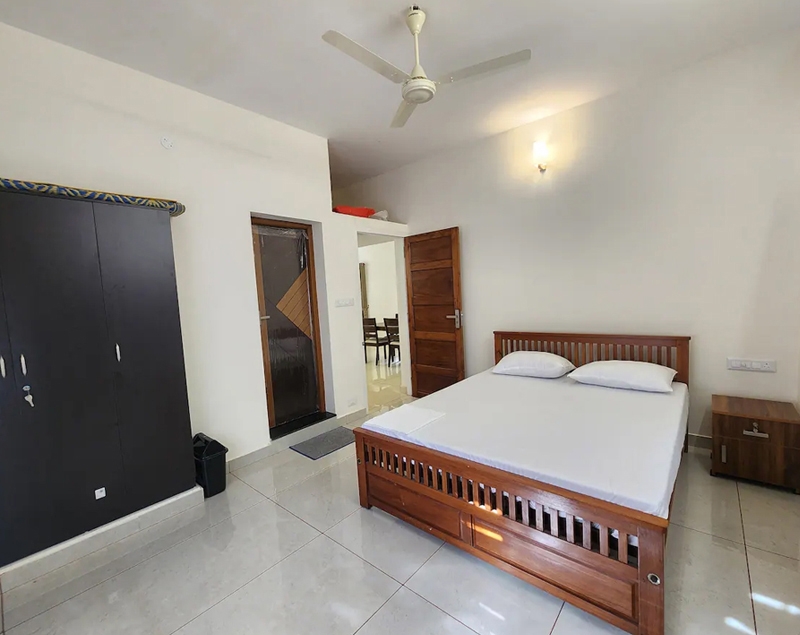 Double bed, air conditioning, attached bathroom, clothes storage, bed linen room-darkening blinds, ceiling fan, balcony access, window with air circulation
